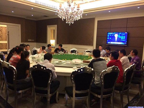 會議結(jié)束后,全體員工歡聚一堂,餐桌上談笑風生,暢所欲言。