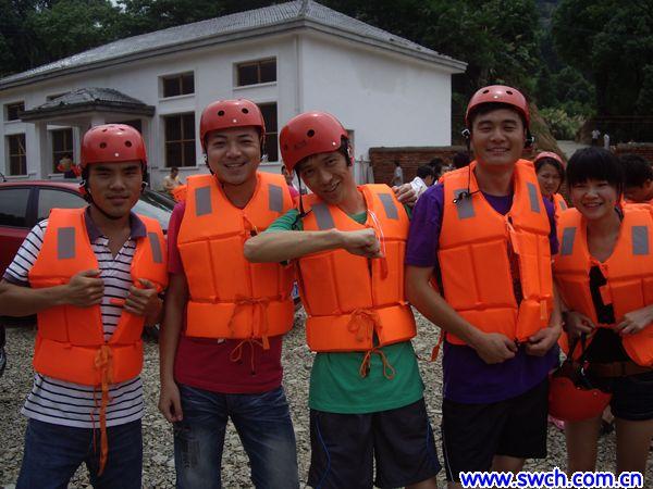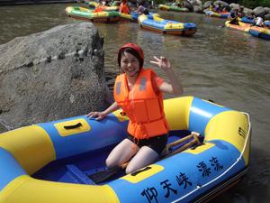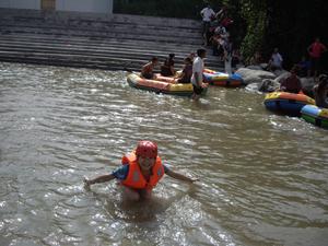 我們早上出發(fā),到達奉新縣還參觀了宋應星公園以及他的作品《天工開物》。吃過午飯,大家興高采烈向“仰天峽”進軍!是在漂流河道的中部,有一段長約一公里的連續(xù)險灘區(qū),考驗著游客的心理承受能力,我們兩兩一組,下水了。打水仗,賽劃艇成了這群人的樂趣;在河道狹窄處,有“交通堵塞”的;在水流湍急處,有“飛天而降”的;在開闊平坦處,有“原地打轉(zhuǎn)”的。形態(tài)各異,但是樂在其中。漂流進行了大約一個半小時,從高處順流而下,直到盡頭。